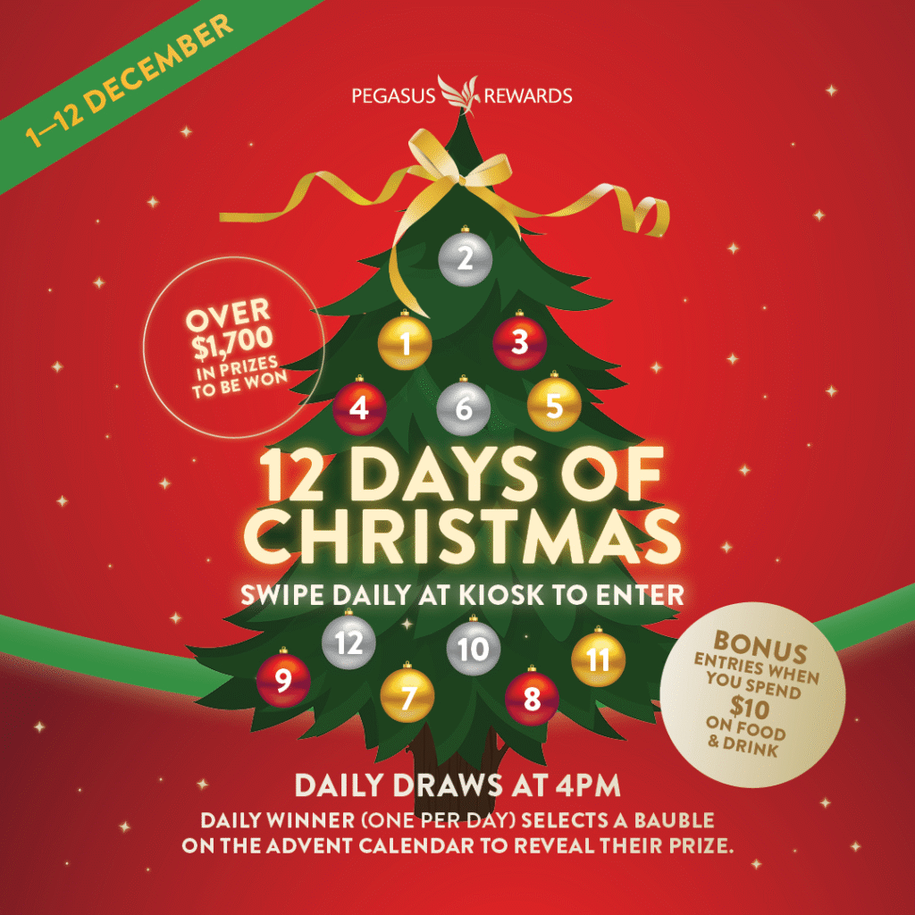 Every day from 1–12 December, Pegasus Rewards members can earn entries in multiple ways.