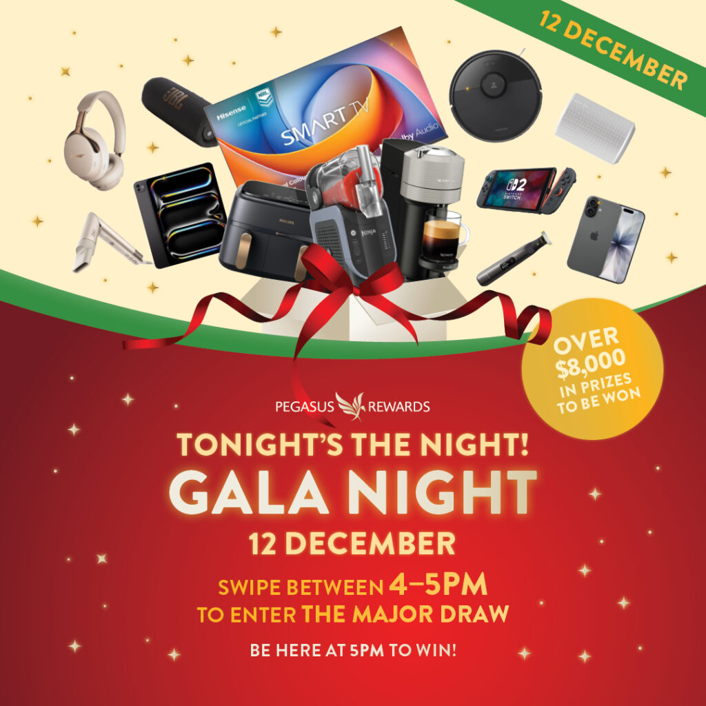 Between 4pm–5pm, members can swipe their Pegasus Rewards card at the kiosk to receive one Gala Night entry.