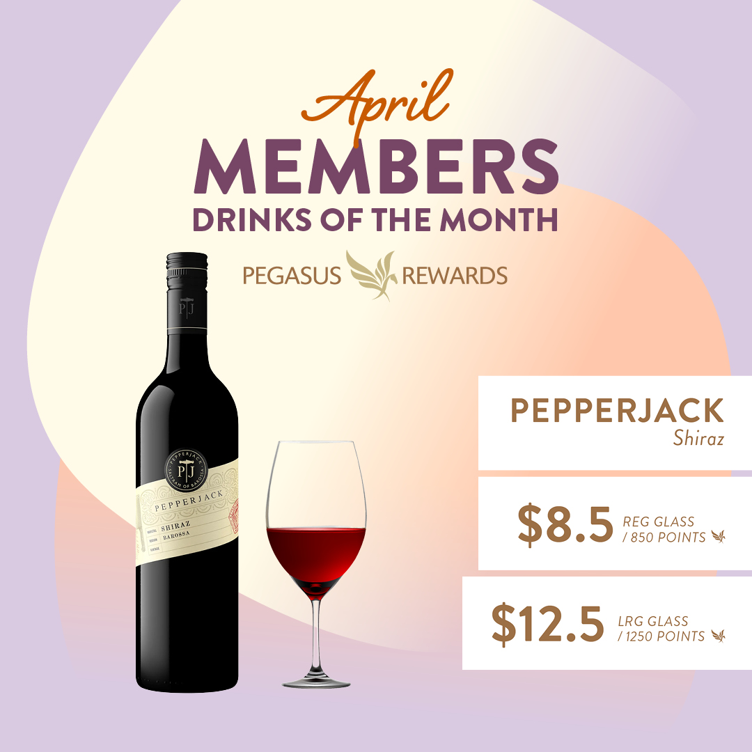 • Pepperjack Shiraz -rich, smooth red Small- $8.50/850pts or Large $12.50/1250pts